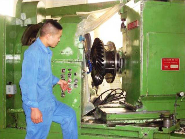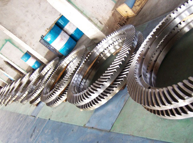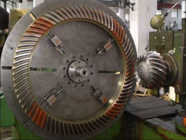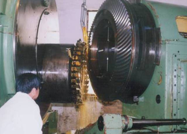 毛坯→正火→粗車齒坯→超聲波探傷→二次正火→半精車齒坯→齒形粗加工(銑齒)→調質→精車→精銑齒→熱處理(滲碳淬火和回火)→齒輪精車→半精磨外圓和端面或內孔和端面→齒形精加工(磨齒)→精磨外圓→齒部進行磁粉探傷和硝酸腐蝕.